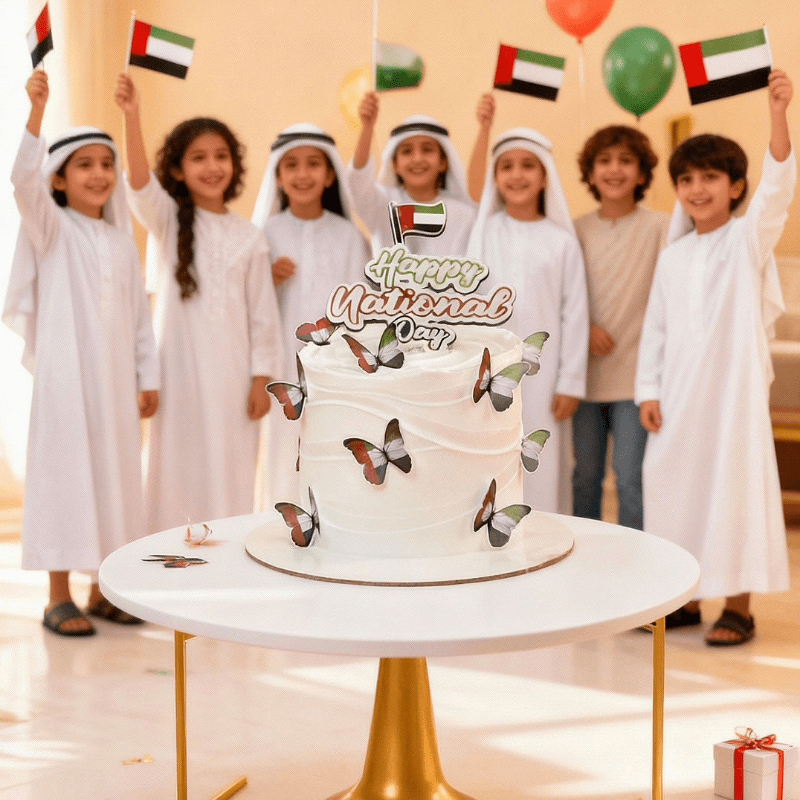 A beautifully crafted Emirates National Day butterfly cake featuring elegant butterfly decorations in UAE colors, perfect for patriotic celebrations.