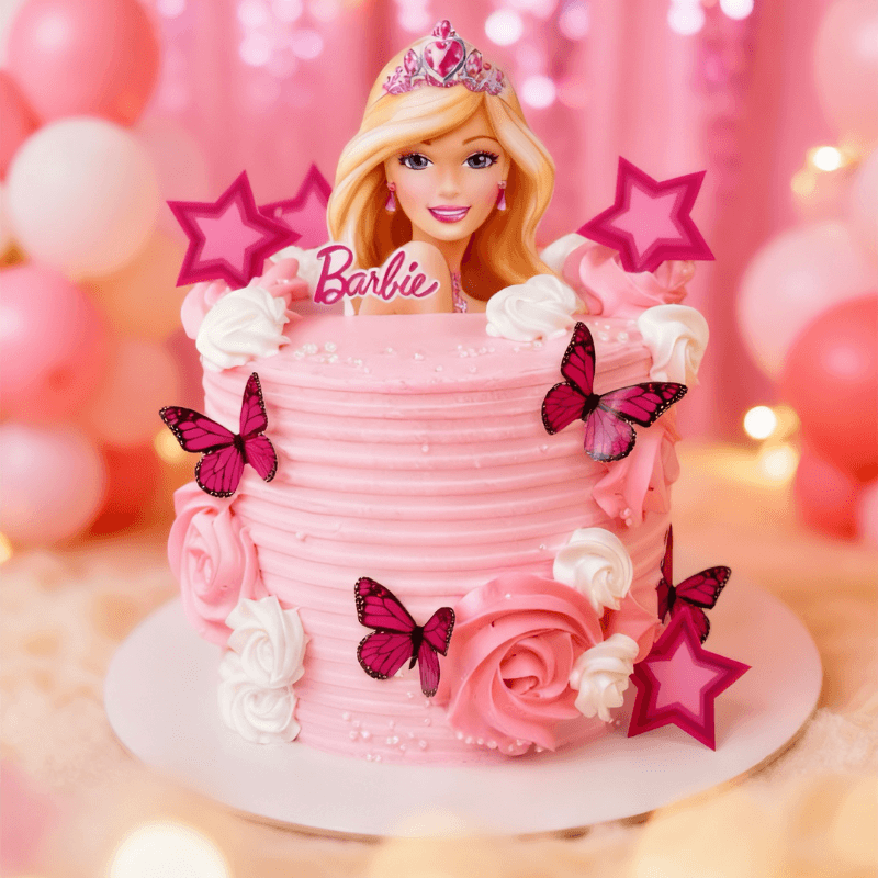 A beautiful pink Barbie butterfly cake with butterfly accents, designed for magical and elegant birthday celebrations.