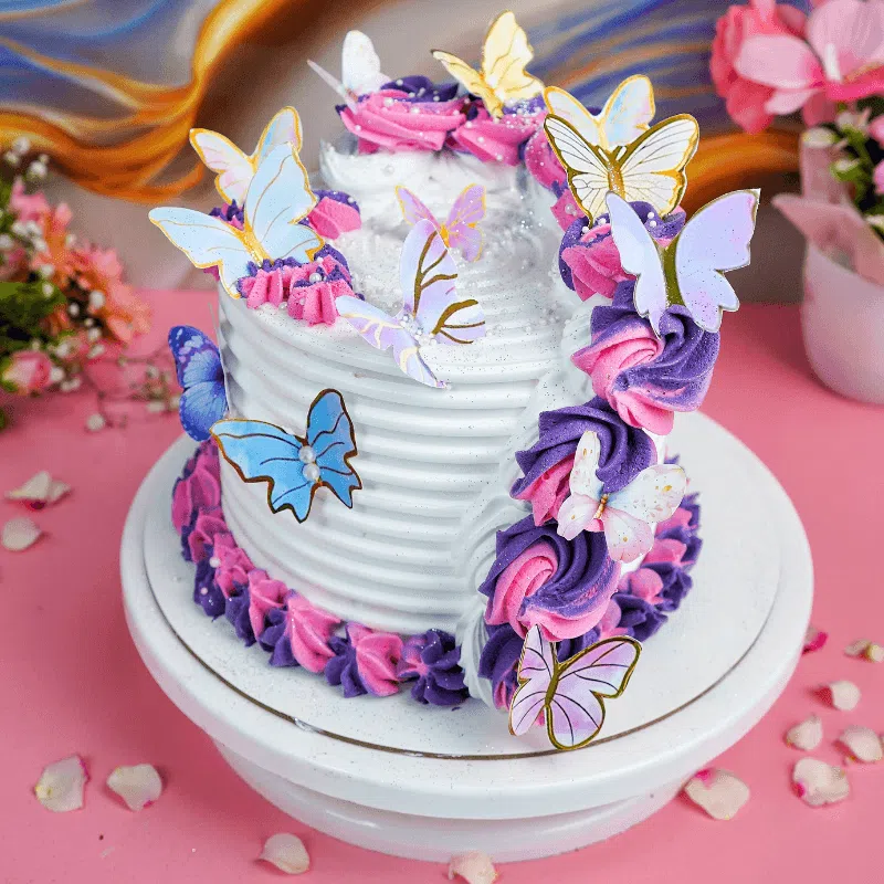 Whimsical and sweet! Our Pink Purple Butterfly Cake is a dreamy delight, fluttering with charm and perfect for magical birthdays and fairy-tale moments!