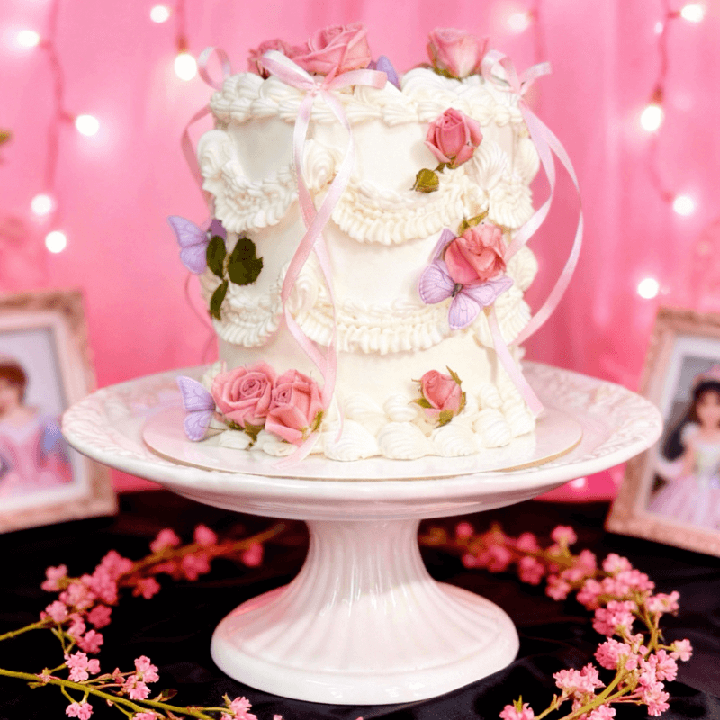 A graceful white vintage pink rose cake with soft pink rose detailing, perfect for classy and minimal celebrations.